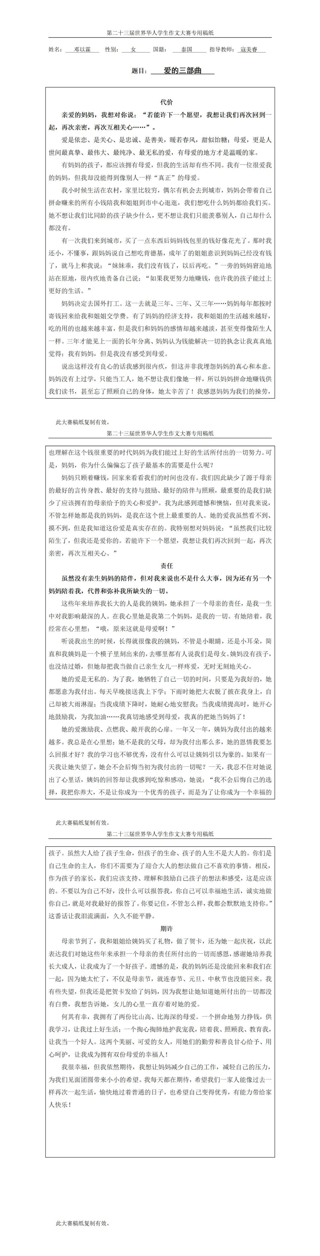 第二十三届世界华人学生作文大赛学生获奖证书