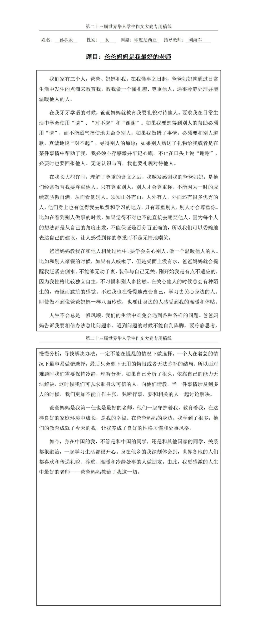 孙孝殷(印尼)《爸爸妈妈是我最好的老师》