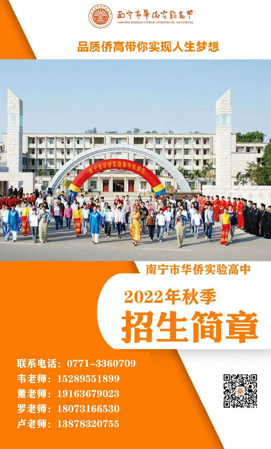 南宁市华侨实验高中是广西华侨学校依托广西侨务优质资源于2003年创办的一所全日制普通高中,是广西唯一一所招收有成班建制海外留学生的高中学校,是南宁市(共84所高中)仅有的五所自治区特色普通高中之一,是南宁市民办学校中唯一一所获评常规管理优秀的学校,具有“国内外招生、海内外升学”特色的国际化高中。